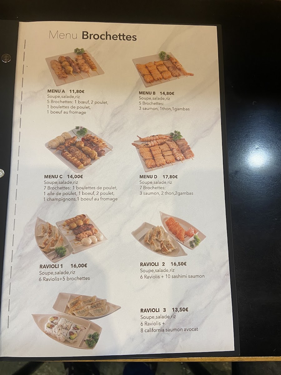 Certainly, the standout stars of the menu are the sushi and brochettes. Customers rave about the freshness and craftsmanship that goes into each dish. Estelle Zakhartchouk sums it up perfectly, stating, "Nous y allons toutes les semaines," confirming the establishment's allure for regular visits. The sushi, though described as a bit small by some, does not skimp on flavor and presentation. Myla noted that even during their wait, the pleasant ambiance and thoughtful servers made for an enjoyable experience. This is a testament to the restaurant's commitment to not just food quality but also guest satisfaction.